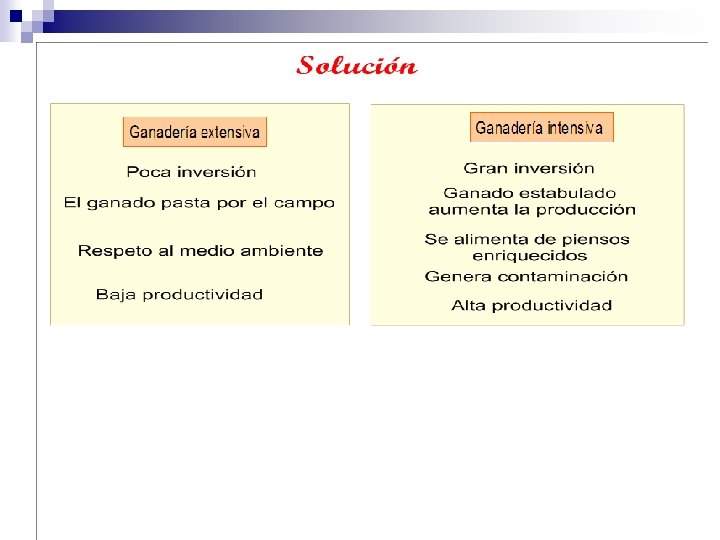 Ganadería extensiva (países desarrollados y subdesarrollados) Grandes explotaciones con muchos pastos naturales. Pocas inversiones en mano de obra, instalaciones, etc. La productividad es baja. Ovino y bovino subdesarrollados). Centro y Oeste de EEUU, Pampa argentina, Este de Brasil, Sur de Rusia, Australia y Sudáfrica. (venta-desarrollados y autoconsumo- Ganadería intensiva (países desarrollados) Explotaciones especializadas. Grandes inversiones con una productividad muy alta. Los animales se crían en régimen de estabulación o semiestabulación. Bovino, porcino y avícola (producción destinada al mercado). Este de EEUU y Canadá, Europa occidental, S. E. de Australia y Nueva Zelanda