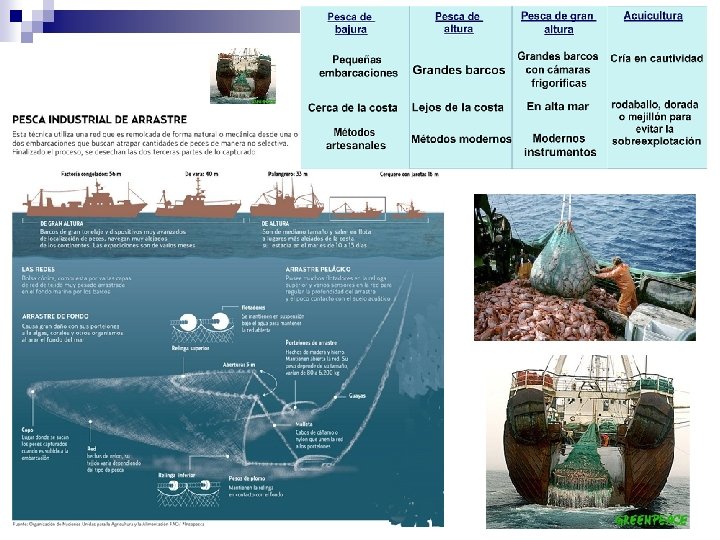 7. 2. Pesca industrial. Para obtener un gran volumen de capturas necesita: Recursos económicos (equipamiento barcos, sistemas de pesca) Tecnología avanzada (aumentar capturas) Infraestructuras portuarias (desembarcar y distribuir la pesca). Pesca de bajura: Barcos pequeños que faenan cerca de la costa. Descargan en la lonja Pesca de altura: Flotas de barcos grandes y bien equipados Permanecen semanas o meses en alta mar Radares, sónares e instalaciones de frío para conservar Gran pesca: Faenan en aguas muy lejanas (barcos nodriza - Factorías) Técnicas de pesca: Arrastre: redes que barren los fondos marinos Descargas eléctricas: atraen los peces, que son succionados.