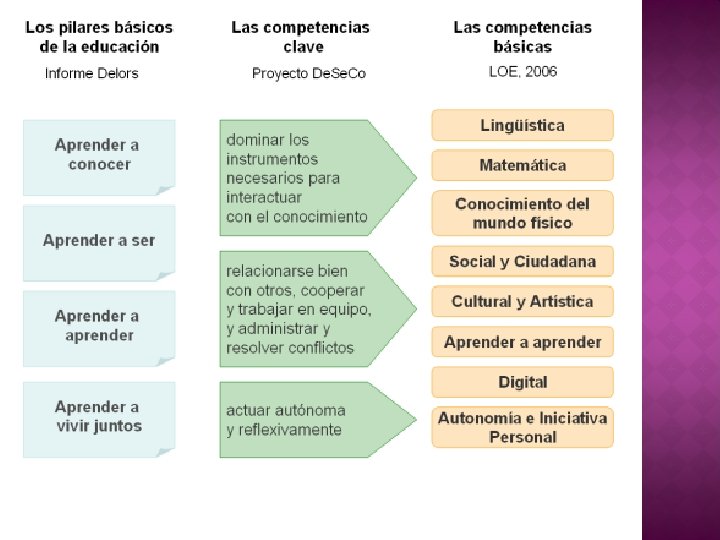 Las competencias básicas permiten transitar por el currículo y seguir aprendiendo toda la vida. Las competencias genéricas son requeridas en todo tipo de empleo y permiten adaptarse al trabajo, así como reconversiones profesionales. Las competencias especificas son la base de la formación profesional y su práctica y enriquecimiento permiten llegar a un perfil experto