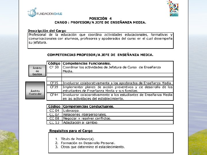 Gestión de Competencias Gestión Escolar de Calidad - FCh • • El informe de la OECD (2004) señala como una debilidad del sistema educativo chileno el débil nexo que existe “entre las reformas y la formación inicial de profesores”. Esto trae como consecuencia prácticas docentes inadecuadas para los altos estándares que exige dicha reforma. Los resultados de la última evaluación docente ubica al 60% de los profesores evaluados en las categorías de insatisfactorio y básico. En las pruebas para la asignación de excelencia pedagógica, sólo un tercio de los docentes que la rinden supera las pruebas de contenidos de su asignatura. Los directivos y profesores del país hacen importantes esfuerzos por realizar gestión y docencia no siempre en las condiciones más adecuadas, con alto grado de compromiso por su trabajo. Por lo tanto no está en juego su vocación y el sentido de entrega, sino la debilidad en Programa Educación-Gestión Escolar Fundación Chile competencias que bien identificadas son www. gestionescolar. cl perfectamente superables a través de la