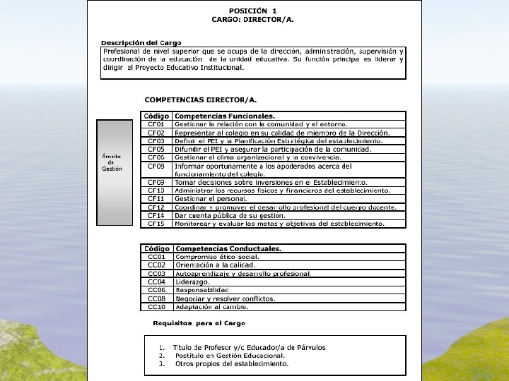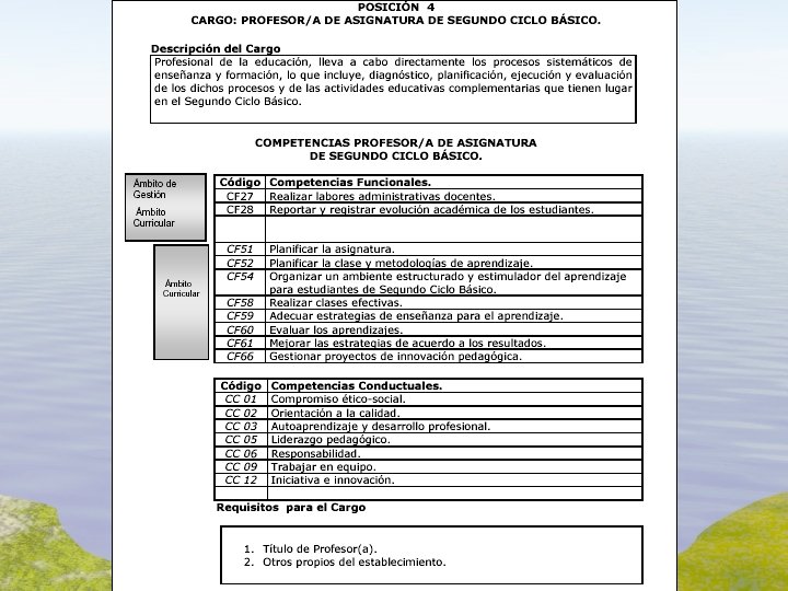 Modelo de Competencias Gestión Escolar de Calidad – FCh Competencia Funcional Es el conocimiento, habilidad, destreza, actitud y comprensión que debe ser movilizada para lograr los objetivos que la ocupación persigue. Tiene relación con los aspectos técnicos directamente relacionados con la ocupación. Se han definido 68 competencias funcionales identificadas con códigos CF 01 a CF 68. § § CF 01 a CF 34: competencias funcionales del ámbito de la gestión. CF 35 a CF 38: competencias funcionales del ámbito curricular.