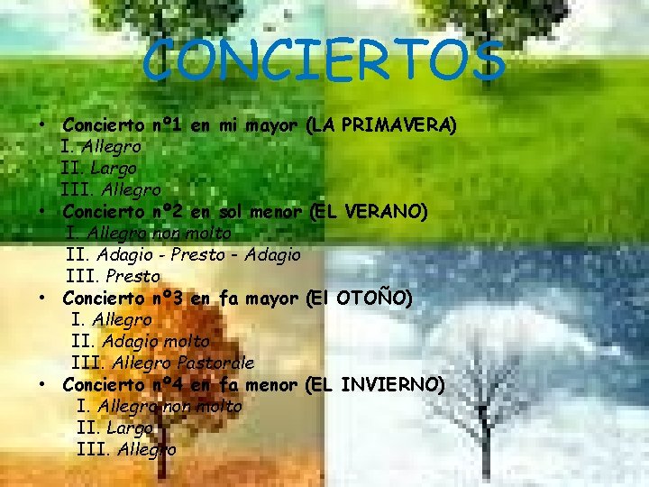 CONCIERTOS • Concierto nº 1 en mi mayor (LA PRIMAVERA) I. Allegro II. Largo III. Allegro • Concierto nº 2 en sol menor (EL VERANO) I. Allegro non molto II. Adagio - Presto - Adagio III. Presto • Concierto nº 3 en fa mayor (El OTOÑO) I. Allegro II. Adagio molto III. Allegro Pastorale • Concierto nº 4 en fa menor (EL INVIERNO) I. Allegro non molto II. Largo III. Allegro