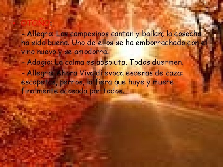 • OTOÑO: - Allegro: Los campesinos cantan y bailan; la cosecha ha sido buena. Uno de ellos se ha emborrachado con el vino nuevo y se amodorra. - Adagio: La calma es absoluta. Todos duermen. - Allegro: Ahora Vivaldi evoca escenas de caza: escopetas, perros, la fiera que huye y muere finalmente acosada por todos.