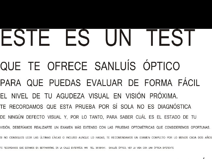 ¿CÓMO LO HACEMOS? • Al ser una prueba donde cuantificamos la agudeza visual en visión próxima, nos tendremos que colocar delante de la pantalla del ordenador a una distancia de unos 40 cms. • La prueba la haremos en monocular; o sea, evaluaremos primero el ojo derecho, tapándonos con la mano el izquierdo y después lo haremos con el otro ojo. Además, la podremos realizar tanto con gafas como sin ellas. • Lo único que debemos hacer es intentar leer el texto incluido en la imagen. La línea más pequeña que consigas leer es la que indica el nivel de tu agudeza visual. Cada línea se corresponde con un nivel de agudeza visual que viene determinado por la escala derecha. • Por ejemplo, si la línea más pequeña que consigues leer es la que indica 20/40, tu agudeza visual es del 50%. Si, por ejemplo, la línea que consigues leer es la del 20/20, tu agudeza será del 100%.