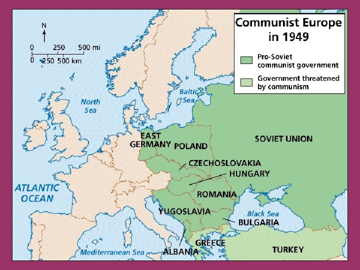 La URSS incrementa su presión sobre el este de Europa • Presencia militar: justificada por la necesidad de crear un cordón de seguridad • El Este se convierte en una barrera geográfica entre la Europa capitalista y la URSS • A partir de 1947 la URSS propicia la instauración de regímenes comunistas en estos países satélites Todo el mundo se convierte en escenario de este pulso
