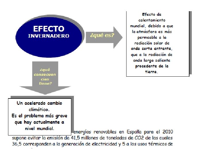 • 4. PROBLEMÁTICAS MEDIOAMBIENTALES El medio ambiente es un entorno en el cual una organización opera, incluyendo el aire, el agua, la tierra, los recursos naturales, la flora, la fauna, los seres humanos y sus interrelaciones. La creciente preocupación por las consecuencias medioambientales, sociales y económicas del cambio climático y su reflejo en los compromisos derivados de los acuerdos de Kioto, junto al hecho de que la producción y el consumo de energía son los principales responsables de las emisiones de gases de efecto invernadero, sitúan al sector energético como clave para alcanzar los objetivos del acuerdo y a la eficiencia energética y el desarrollo de las energías renova bles como los principales instrumentos para conseguirlos. De los seis gases o grupos de gases del efecto invernadero, contemplados en el protocolo de Kioto, el CO 2 representa por sí solo las tres cuartas partes del total, y más del 90% de aquél es de origen energético.
