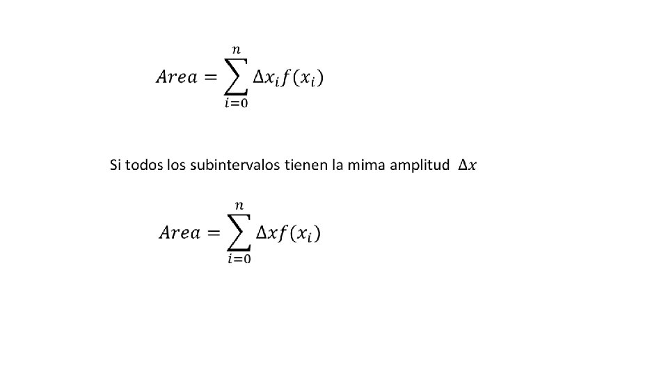 • El área aproximada es igual a la suma de todas las áreas de los rectángulos que se tienen en cuenta en la partición realizada • Si los subintervalos tienen la misma amplitud, se defina el • Donde n es el numero de divisiones realizadas en el intervalo