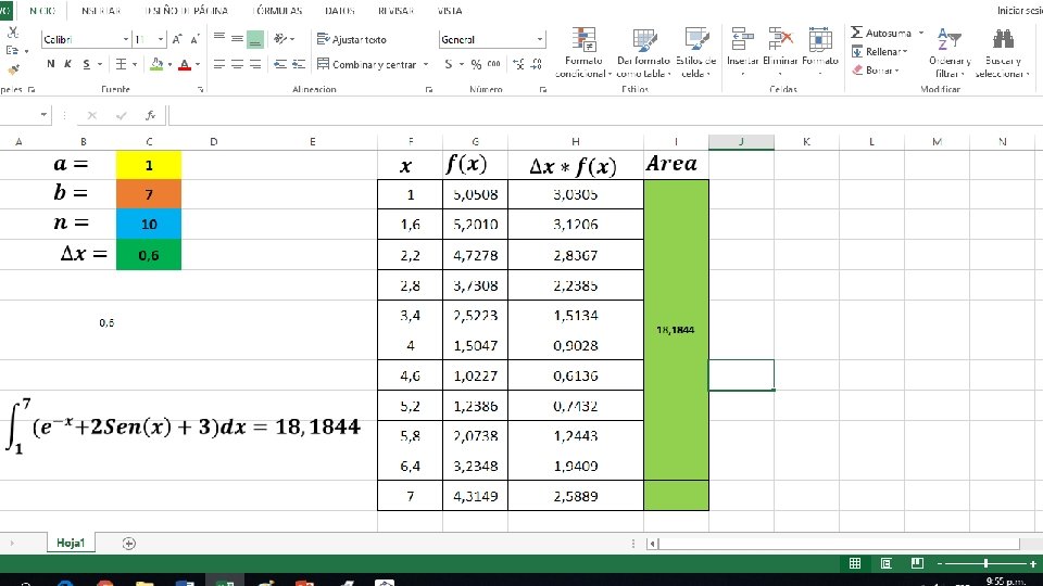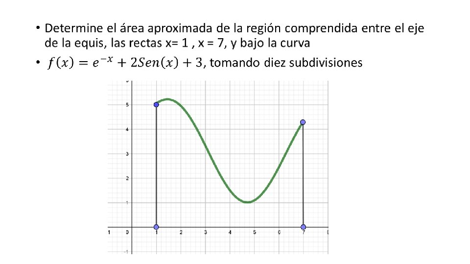 • EJEMPLO. Aproximar mediante sumas de Riemman, la siguiente integral, tomando n= 15 • Sabemos que
