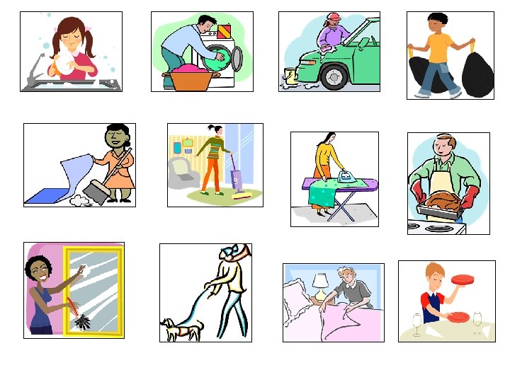 Tengo que… I have to… 1. Fregar los platos 2. Lavar la ropa 3. Lavar el coche 4. Sacar la basura 5. Limpiar el salón 6. Pasar la aspiradora 7. Planchar la ropa 8. Preparar la comida 9. Quitar el polvo 10. Pasear al perro 11. Hacer la cama 12. Poner la mesa • • • wash the dishes wash the clothes wash the car take out the rubbish clean the living room hoover iron the clothes prepare the food get rid of the dust walk the dog make the bed lay the table