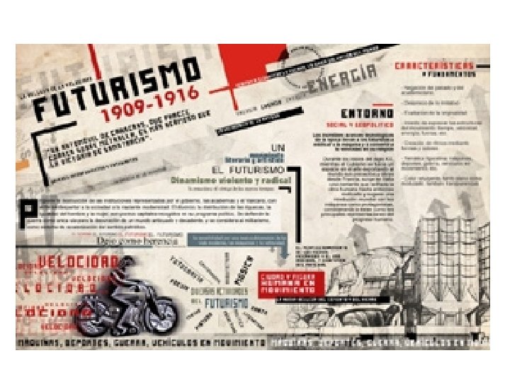 Rasgos del Ultraísmo • El poema ultraísta deja notar las influencias del cubismo, del futurismo y del dadaísmo. • Imágenes y metáforas chocantes, ilógicas, donde destacan el mundo del cine, del deporte, del adelanto técnico: "Los motores suenan mejor que endecasílabos" (Guillermo de Torre). • Eliminación de la rima • Tendencia a establecer una disposición tipográfica nueva de las palabras del poema, pretendiendo de ese modo hacer ver una fusión de la plástica y la poesía. • Neologismos, tecnicismos y palabras esdrújulas. •