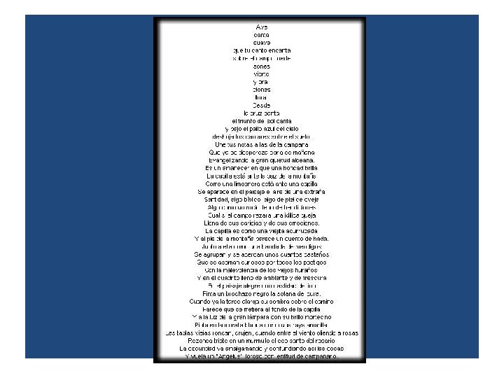 Características del Ultraísmo • • En cuanto a los géneros literarios: predilección por la poesía lírica y predomino del culto a la imagen y la metáfora (reducción de la lírica a su elemento primordial: la metáfora). Una poesía entendida como síntesis y fusión de imágenes y estados anímicos: simultaneísmo, velocidad imaginativa. En el contenido teórico: supresión del elemento sentimental y erótico, del confesionalismo o posibles referencias morales. Preferencia por temas de la vida moderna, tratando de descubrir sus connotaciones líricas. Se trata de vislumbrar el fondo primigenio de las realidades del mundo. En el plano lógico y sintáctico: se suprimen las cadenas de nexos y las fórmulas de equivalencia (como, semejante a), se eliminan los adjetivos, etc. , con lo cual se rompe la continuidad del discurso, resaltando las percepciones fragmentarias, con la convicción de que se está potenciando de esta forma la pureza del flujo lírico. En el aspecto formal: supresión de elementos ornamentales; desaparición de la rima y de ciertos valores retóricos y musicales, y atención a los valores visuales y plásticos: los ultraístas relacionan la poesía con la pintura y la arquitectura, se entusiasman con el cubismo; de ahí su interés por imitar gráficamente los objetos sugeridos en el poema por medio de una presentación tipográfica en la que se juegan los espacios en blanco, las alineaciones quebradas, las ondulaciones y círculos y otras figuras geométricas.
