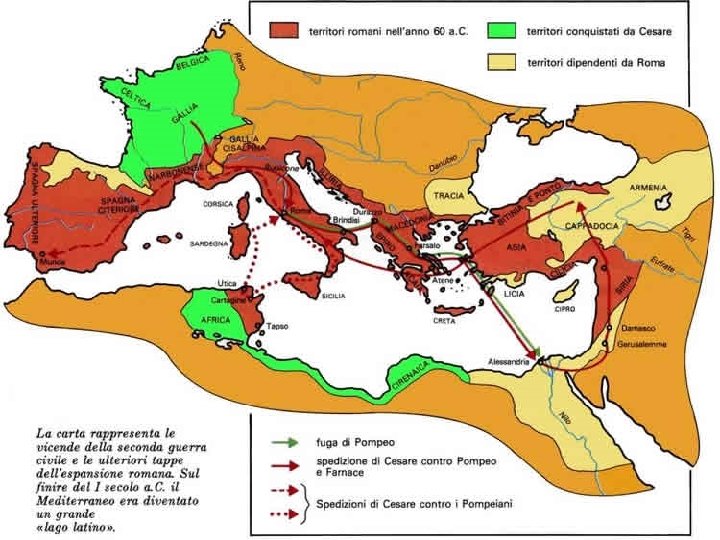 • Nel frattempo, in Asia Minore si era ribellato il re del Ponto Farnace ( figlio di Mitridate). Cesare, costretto a lasciare l’Egitto, nel 47 a. C. lo sconfisse a Zela con tale rapidità che la notizia venne comunicata al senato con un’altra delle sue frasi diventate storiche: “Veni, vidi, vici”. • Recatosi quindi in Africa, nel 46 a. C. sconfisse a Tapso i seguaci di Pompeo superstiti (tra cui Catone il Giovane), che avevano trovato rifugio alla corte di Giuba, re di Numidia. Ad Utica Catone il Giovane preferì uccidersi piuttosto che assistere alla fine della libertà repubblicana (per questo verrà soprannominato Catone l’Uticense). Gli ultimi seguaci di Pompeo furono definitivamente battuti nel 45 a. C. a Munda, nel sud della Spagna. • Cesare era ormai padrone di Roma