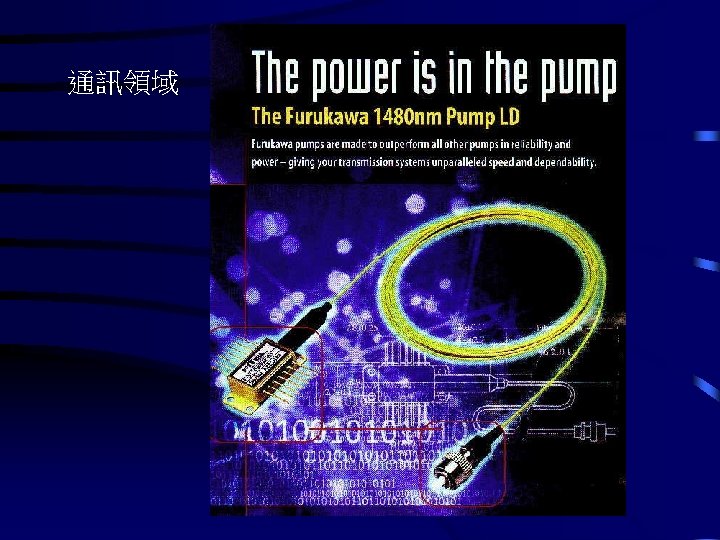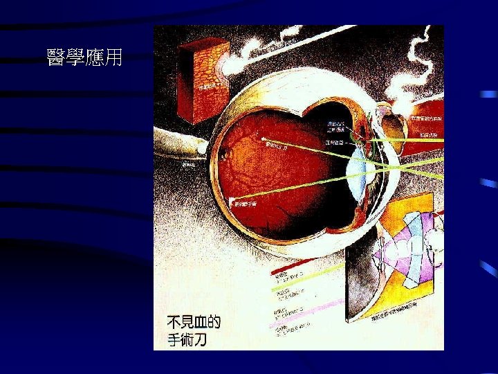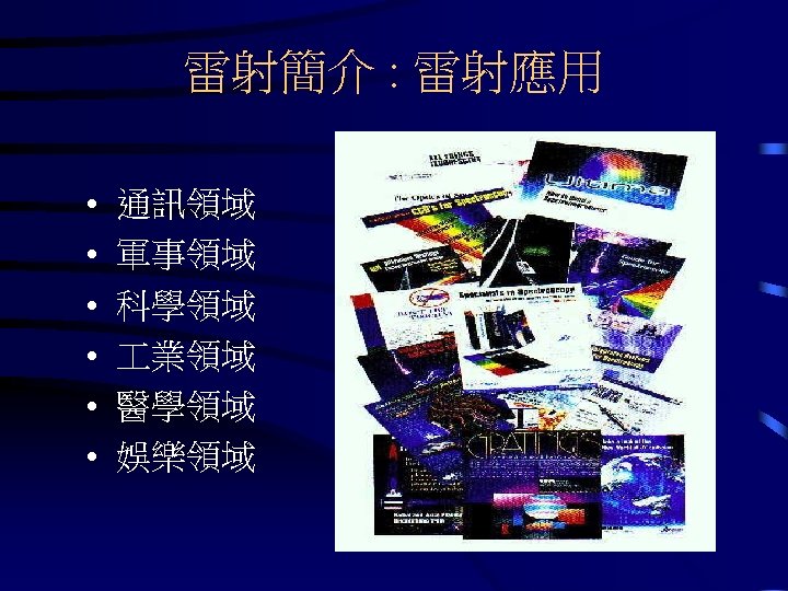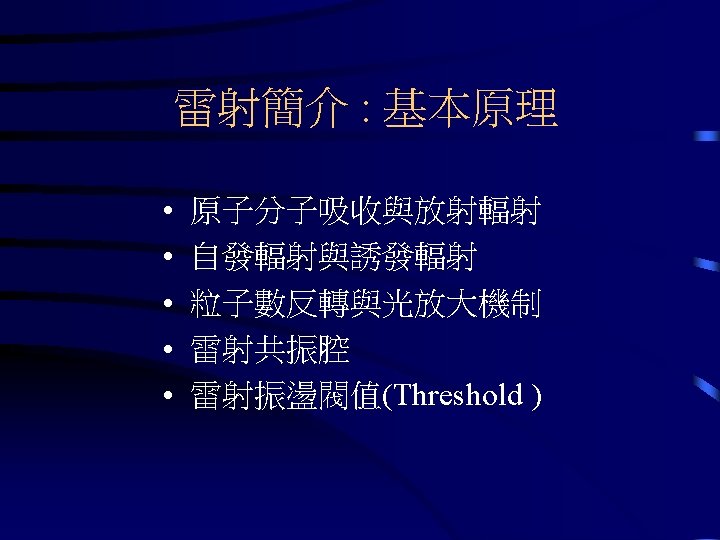 雷射簡介 : 雷射分類 • Gain Medium : – – Solid State (Doped Insulator) Laser Gas Laser Dye Laser Semiconductor Laser • Excitation Method: – – Optical Pumping Electric Excitation Chemical Reaction Thermal Excitation