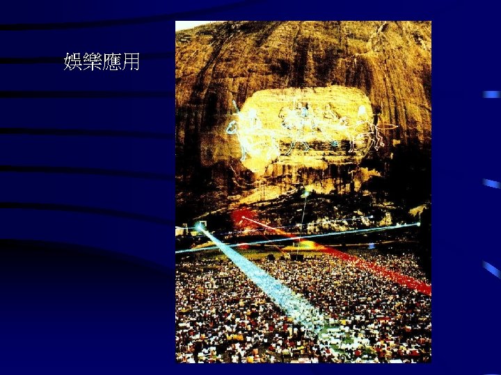 雷射簡介 : 雷射的特性 • 雷射 : LASER Light Amplification by Stimulated Emission of Radiation First Laser : 1960 Theodore H. Maiman - Ruby Laser • 雷射光特性 : – – 高同調性 (Coherence) 高單色性 (Monochromatity) 高亮度 (Brightness) 高方向性 (Directionality) • 雷射光源與傳統光源的比較