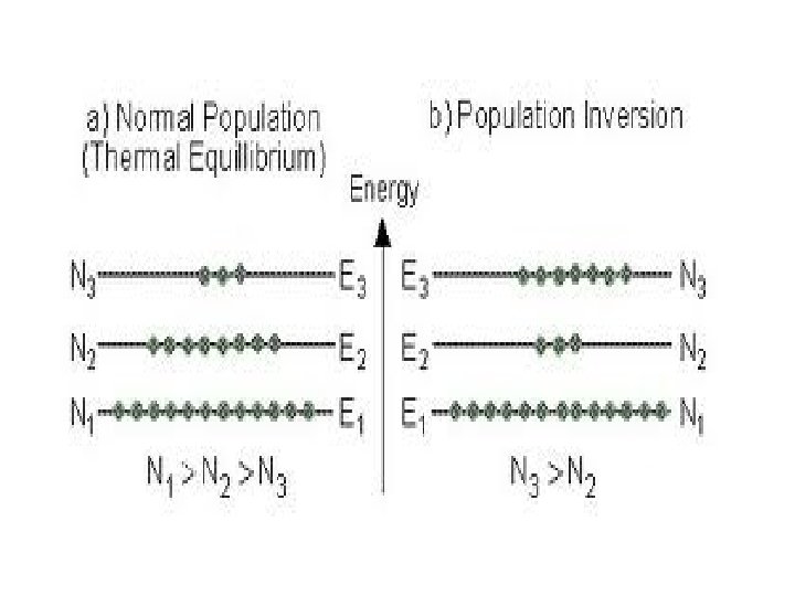 • Life time: - The time for which atom remains in excited state is known as life time. • Metastable state : - The life time of atom is very small. For hydrogen it is 10 -8 sec. But there exists such excited states in which life time is greater than 10 -8 sec. This state is called metastable state. • Population inversion: - Populations means number of active atoms occupying an energy state. Generally population of lower energy level is high and that of higher energy level is low. But for stimulated emission, population of higher energy level should be high. Making population of higher energy level more than that of ground state is called population inversion. N 1 – population of ground state, N 2 – population of higher energy state then making N 2>>N 1 is called population inversion.