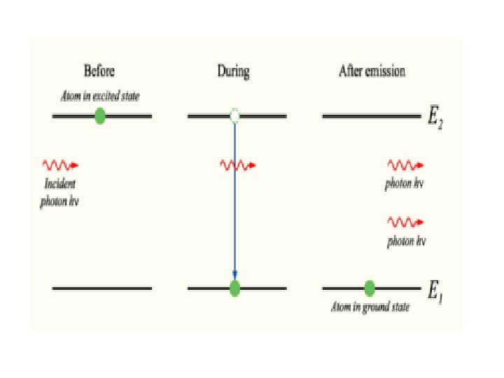 • In spontaneous emission, emitted radiations are random in directions, random in phase i. e. radiations are incoherent. • Stimulated emission: - When atom in excited state and before coming to ground state if it is triggered due to action of an incident photon. The interaction between excited atom & incident photon can trigger the excited atom to makes transition to ground state. This transition generates another photon which is identical to incident photon. This process of forced emission of photon due to incident photon is called as stimulated emission. • In stimulated emission, emitted radiations are in same phase i. e. coherent & monochromatic.