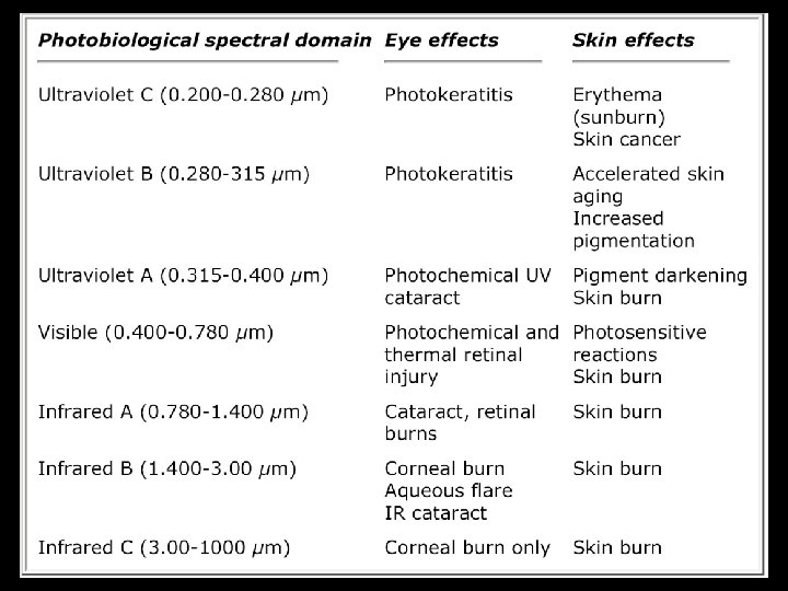 The effects of the laser depends strongly on the wavelength http: //www. adtdl. army. mil/cgi-bin/atdl. dll/fm/8 -50/INTRO. htm