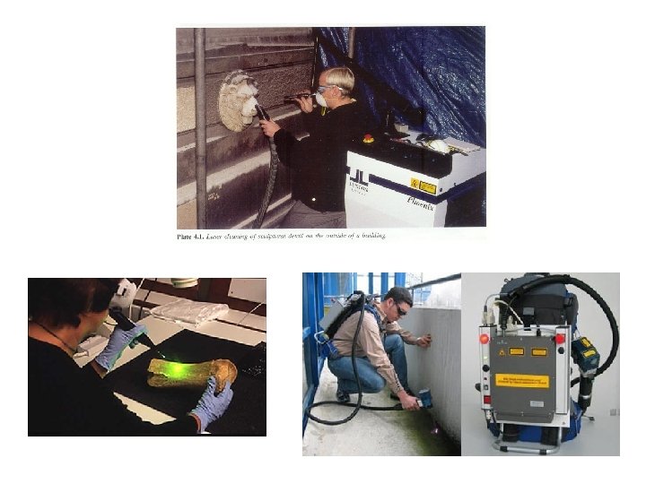 Čištění laserovým paprskem Nd: YAG Excimer Er: YAG Pulsní CO 2 Průmysl: Polymerní povlaky Koroze Ropné produkty Částice nečistot Dezinfekce Ochrana KD: Koroze Inkrustace Sediment Mikroorganismy Graffitti Přemalby
