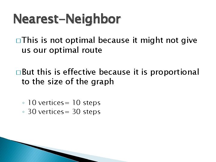 Nearest-Neighbor � This is not optimal because it might not give us our optimal route � But this is effective because it is proportional to the size of the graph ◦ 10 vertices= 10 steps ◦ 30 vertices= 30 steps