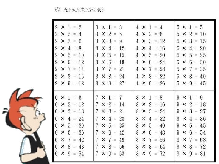 jiǔ biǎo 九 九 表 nine-nine table <Chinese multiplication table>