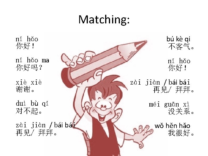 Greeting and Goodbye nǐ hǎo 你好!Hello! nǐ hǎo mā 你好吗?How are you ? wǒ hěn hǎo 我很好。I’m pretty good. xiè 谢 谢。Thank you. bú kè qì 不客气。You are welcome. duì bù qǐ 对不起。I'm sorry. méi guān xì 没关系。That's all right. zài jiàn / bái bái 再 见 / 拜 拜。Bye.