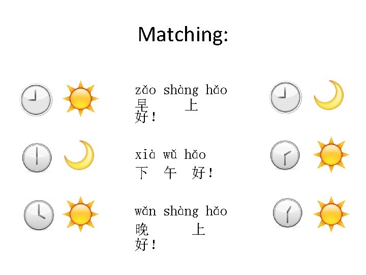 zǎo shàng hǎo 早 上 好! Good morning! xià wǔ hǎo 下 午 好! Good afternoon! wǎn shàng hǎo 晚 上 Good evening! 好!
