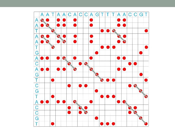 Dot plot • Graphical method that allows the comparison of two biological sequences and identify regions of close similarity between them. • Also used for finding direct or inverted repeats in sequences. • Or for prediction regions in RNA that are selfcomplementary and therefore have potential to form secondary structures.