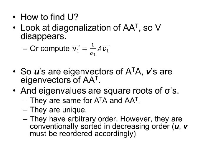 Uniqueness of SVD • non-equal singular values (non-degenerate) – U, V are unique except for the signs in columns – Once you decide signs for U (V), signs for V (U) are given so that A = UΣVT is guaranteed • equal non-zero singular values (degenerate) – not unique – if u 1 and u 2 correspond to the degenerate σ, also their any normalized linear combination is a left singular vector corresponding to σ – the same is true for right singular vectors