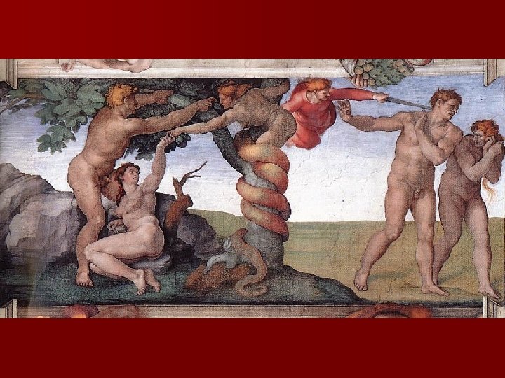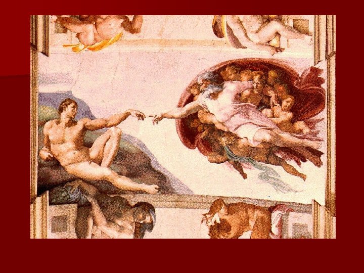 Sistine Chapel Ceiling n Pope Julius II asked for a few vines on a blue background on the 10, 000 square feet. n Over 340 human figures represented the origin and fall of humanity in Michaelangelo’s painting. n It took a little less than four years (1508 -1512) without assistance under adverse conditions by Michaelangelo.