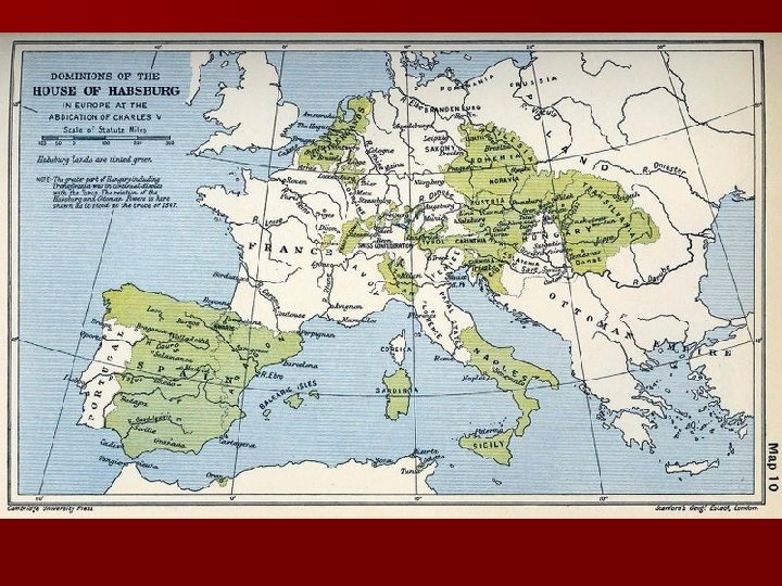 Hapsburg Empire n Charles’ brother, Ferdinand, reigned over the German regions of the Empire (as well as King of Hungary and Bohemia). Ultimately, Ferdinand would become Holy Roman Emperor in 1556 and Charles’ son Philip would become King of Spain and ruler of the low countries (Belgium, Netherlands) n Ferdinand continued the Hapsburg dynasty in Germany as well as Bohemia and Hungary along with parts of Italy.