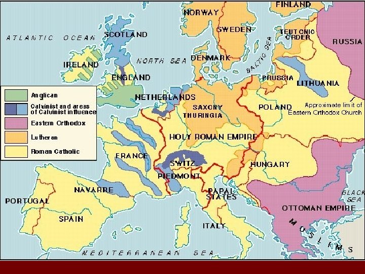 Political Realities in Germany No centralized government; thus, territorial autonomy the norm. n Emperor is elected and dependent upon the respective parts of the empire. n Germany undergoing economic growth (Fugger banking) n No unity: n – – – 25 secular principalities 90 ecclesiastical principalities Castles of Independent Knights Free Cities Over 100 Counts