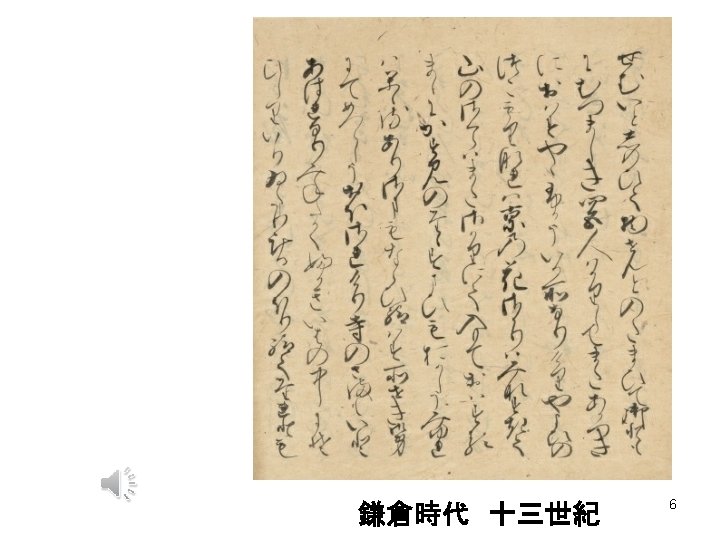 Late Old Japanese (794 -1192 ) • When the final syllable of the adverbial form was /ti/, /fi/, or /ri/, the sequence with te became /tte/. – mati ‘wait’ + te > matte – ifi ‘say’ + te > itte – ari ‘exist’ + te > atte • Some occurrences of /ku, gu, fi, bi, mi/ became /u/. – nikuku ‘feeling disgusted’ > nikuu (= nikū) – kanasiku ‘being sad’ > kanasiu 5