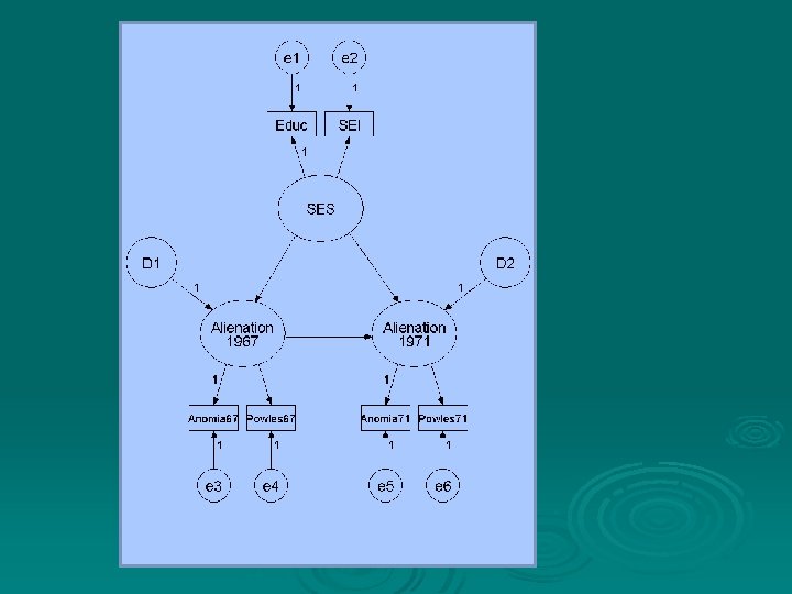 Structural model relates alienation in 1971 (F 2) to alienation in 1967 (F 1) and SES (G). F 1 and F 2 endogenous, G exogenous F 2 i = βF 1 i + g 2 Gi+u 2 i F 1 i = g 1 Gi + u 1 i Measurement model for alienation yji=aj + j. F 1 i j=1, 2 yji=aj + j. F 2 i j=3, 4 Measurement model for SES xji=dj + j. Gi j=1, 2