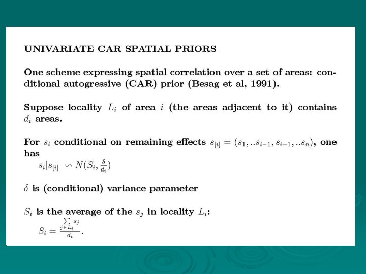 Spatial Priors for Geographic Health Datasets Conditional Autoregressive (CAR) priors Ø These are priors for “structured” effects (labels of areas are important) as opposed to unstructured iid effects (exchangeable over different labellings) Ø Spatial factors represent unmeasured area level health risks varying relatively smoothly over space (regardless of arbitrary administrative boundaries) Ø