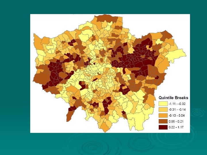 Example: Index of Coronary Heart Disease for Small Areas, IJERPH 2010 Ø Univariate index of CHD morbidity (p=1) for London small areas using M= 4 observed small area health indicators. Ø First two small area indicators (y 1, y 2) are male and female CHD deaths, while (y 3, y 4) are male and female hospitalisations for CHD
