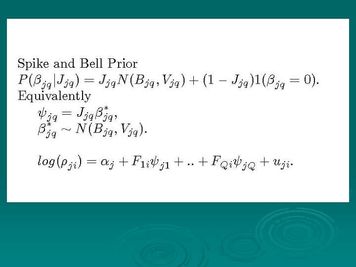 Spline Models Or spline for nonlinear effects in common factor score si. Under fixed variance var(s)=1 option, site knots wk at selected quantiles on cumulative standard normal. Ø Then linear spline log( ij)=aj+ jsi+ kbjk(si- wk)+ Ø bjk random effects. Difference penalties on bjk replaced by stochastic analogues (random walk priors) Ø Ref: Lang, S. , Brezger, A. (2004). Bayesian Psplines Ø
