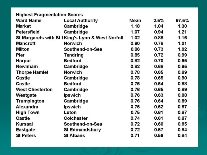Case Studies Ø Social capital & mental health, multilevel model using Health Survey for England Ø Suicide and social indicators, spatial factors in ecological study for small areas (wards) in Eastern England Ø Cost progression in atrial fibrillation patients: Medicare patients in US. Latent morbidity defined by reflexive and formative indicators