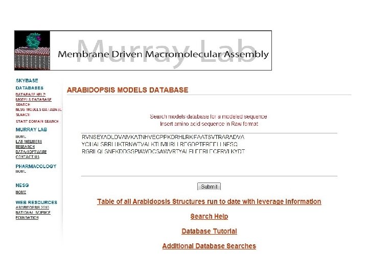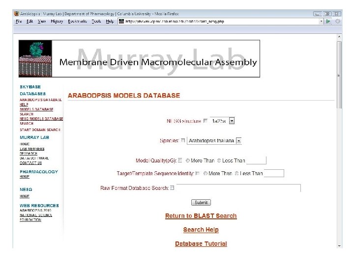 High-throughput modeling of cellular signaling proteins Protein families involved in membrane-mediated subcellular targeting Within and across families, within and across genomes → Developed methods to reliably model all instances of peripheral proteins Tonya Silkov: Nebojsa Mirkovic: Hunjoong Lee: Frank Indiviglio: Paul Murray: Anna Mulgrew-Nesbitt: Janey Li: Zheng Li: Meng Wang: Mariam Konate: Arabidopsis 2010 project Phosphoinositide-binding domains in the human genome Structural genomics high-throughput modeling Database structures for integrating structures and predicited models Formation of retroviruses and host/virion interactions Phosphoinositide-modifying enzymes: PTEN and PLCs Synaptic vesicle exocytosis Simulation of the structure and dynamics of phosphoinositides Integration of structure-focused tools into ge. Workbench Modeling of phosphoinositide signaling http: //ph 7 wnu. cpmc. columbia. edu/