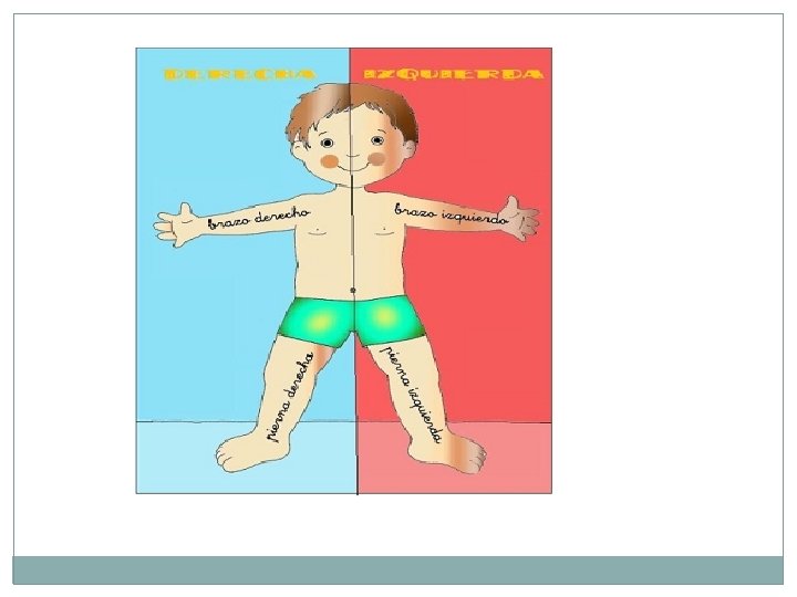 Objetivos de la lateralidad Afirmar la lateralidad RECONOCER LA DERECHA E IZQUIERDA SOBRE SÍ MISMO MEJORAR LAS APTITUDES PERCEPTIVOS MOTRICES DE LATERALIDAD Y DIRECCIONALIDAD CONOCER Y LOCALIZAR OTRAS PARTES DE NUESTRO CUERPO Situar un objeto con Observar la dominancia lateral visual y auditivo. relación a nuestro cuerpo Observar la dominancia lateral manual y pédica