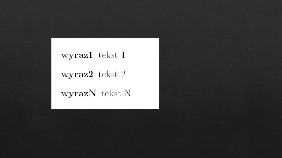 ![description documentclass[a 4 paper, 11 pt]{article} usepackage{polski} usepackage[cp 1250]{inputenc} usepackage{enumerate} begin{document} begin{description} item[Pierwszy] Pierwszy description documentclass[a 4 paper, 11 pt]{article} usepackage{polski} usepackage[cp 1250]{inputenc} usepackage{enumerate} begin{document} begin{description} item[Pierwszy] Pierwszy](https://slidetodoc.com/presentation_image/550c9f33b60648bca22a88b09231180c/image-61.jpg)