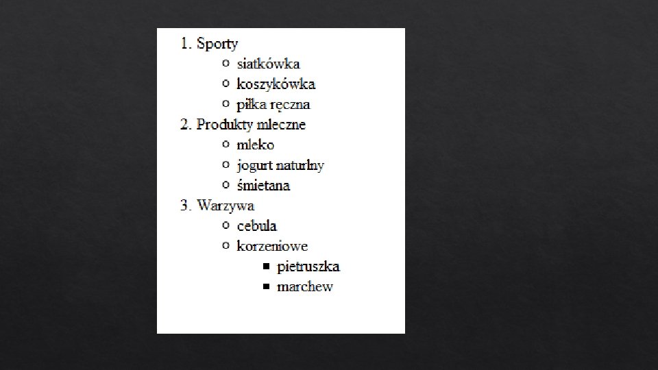 begin{itemize} item To jest tekst 1 pierwszego poziomu. item To jest tekst 2 pierwszego poziomu. begin{itemize} item Tekst 1 drugiego poziomu. item Tekst 2 drugiego poziomu. end{itemize} item To jest tekst 3 pierwszego poziomu. end{itemize}