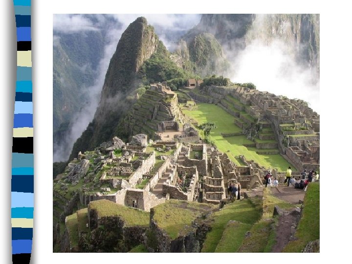 n The Inca lived in South America, Andes, in Peru and Chile. n Cuzco: Capital n The Inca built a system of roads through the Andes Mountains to connect their empire. n The Inca did not have a writing system n Quipu: number system: knotted cords represent item or number. n Fransisco Pizarro conquered Incas