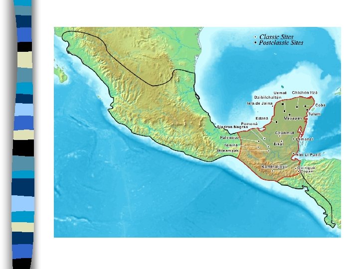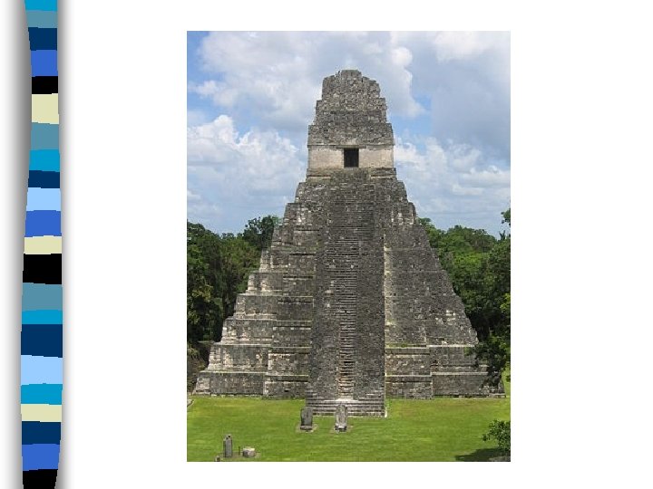 Maya n n n The Maya – southern Mexico and northern Central America Tikal, Guatemala = great city established Skilled in math, developed calendars, used astronomy to predict solar eclipses Glyphs Descendants live in Villages of Southern Mexico