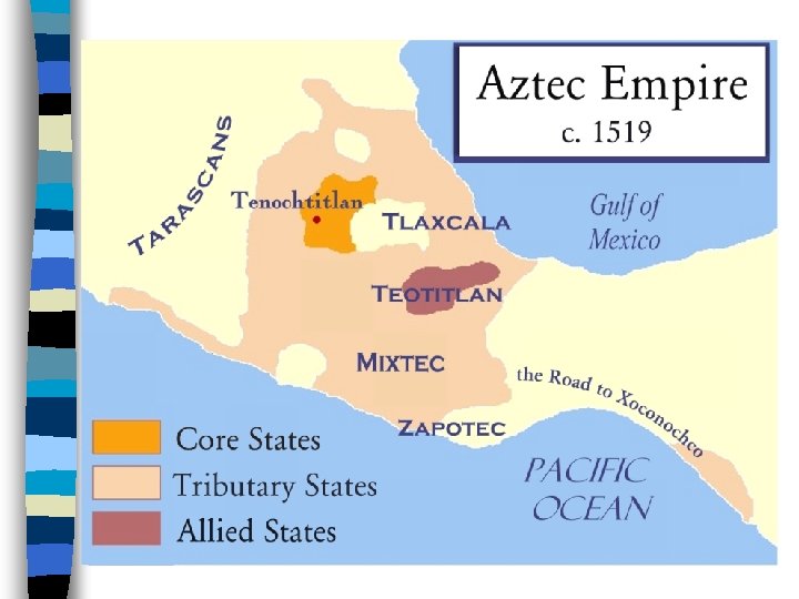 Aztec The Aztec lived in central Mexico. n Their capital was called Tenochtitlan. n – Now, Mexico City stands on the ruins of the Aztec capital. The Aztec also practiced sacrifice and built large pyramids like the Maya. n Spanish: Cortes conquered them n Chocolate! n