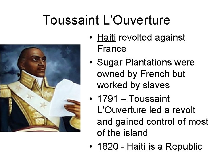 Toussaint L’Ouverture • Haiti revolted against France • Sugar Plantations were owned by French but worked by slaves • 1791 – Toussaint L’Ouverture led a revolt and gained control of most of the island • 1820 - Haiti is a Republic