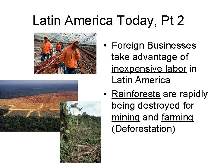 Latin America Today, Pt 2 • Foreign Businesses take advantage of inexpensive labor in Latin America • Rainforests are rapidly being destroyed for mining and farming (Deforestation)