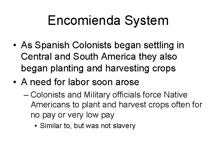 Encomienda System • As Spanish Colonists began settling in Central and South America they also began planting and harvesting crops • A need for labor soon arose – Colonists and Military officials force Native Americans to plant and harvest crops often for no pay or very low pay • Similar to, but was not slavery