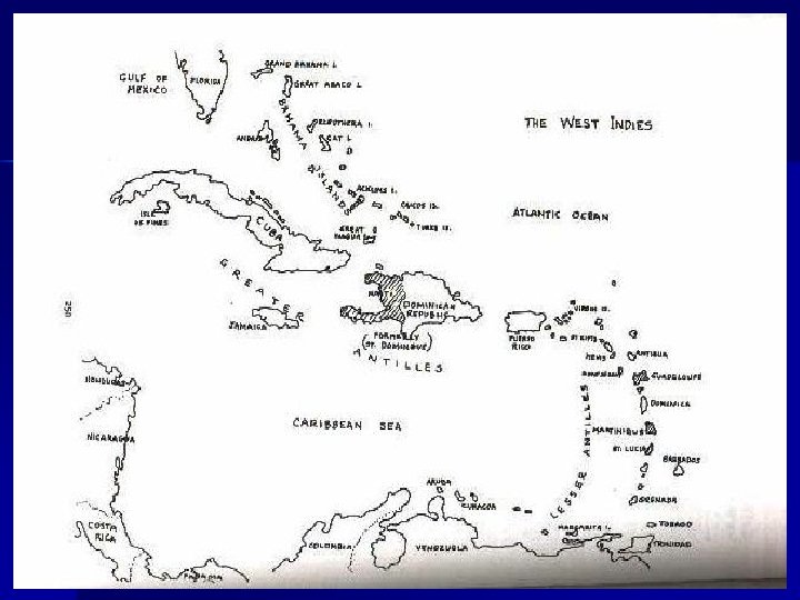 Islands of the Caribbean n Consist of 3 major groups: – Bahamas – Greater Antilles – Lesser Antilles n All together are sometimes called the West Indies and are what Columbus discovered when he came to the western hemisphere