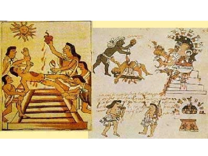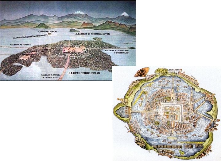 Aztec • Located in central Mexico 1200 – 16 th century when they were taken over by the Spanish • Fierce warriors, conquered many people and offered them as human sacrifices to please their gods • 1325: built their capital, Tenochtitlan on Lake Texcoco
