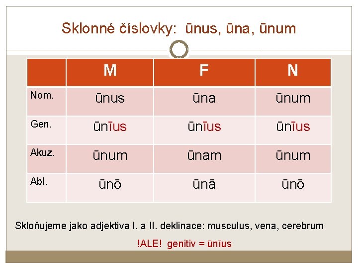 Sklonné číslovky: ūnus, ūna, ūnum M F N Nom. ūnus ūna ūnum Gen. ūnīus Akuz. ūnum ūnam ūnum ūnō ūnā ūnō Abl. Skloňujeme jako adjektiva I. a II. deklinace: musculus, vena, cerebrum !ALE! genitiv = ūnīus